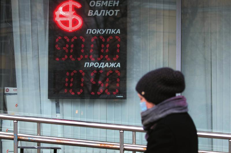 2月24日,在俄罗斯首都莫斯科,行人经过一家外汇兑换点的汇率显示屏。莫斯科证券交易所24日的数据显示,在俄总统普京宣布决定在顿巴斯地区发起特别军事行动后,俄罗斯本币卢布汇率暴跌。俄罗斯央行网站24日发布公告说,为稳定金融市场,俄央行决定干预外汇市场,为银行业提供额外流动性。 据新华社