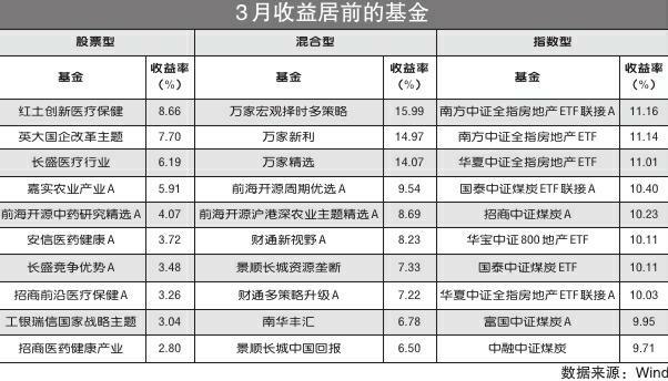 从涨幅榜来看,重仓医药生物和农业板块的基金表现不错。具体来看,红土创新医疗保健、英大国企改革主题、长盛医疗行业、嘉实农业产业A、前海开源中药研究精选 A 涨幅靠前,收益率分别为8.66% 、7.70% 、6.19% 、5.91% 、4.07%。其中,红土创新医疗保健在去年四季度末重点配置了医药生物板块个股,前十大重仓股分别有红日药业、新天药业、华润三九、泽达易盛、悦康药业、以岭药业、澳华内镜、天力士、桂林三金。嘉实农业产业A则在去年四季度末重点配置了农业板块,前十大重仓股有牧原股份、大北农、海大集团、隆平高科、伊利股份、双汇发展等。3月期间,申万一级行业指数显示,31个行业中仅有5个行业实现正向收益,其中农林牧渔、医药生物板块分别实现2.94%、0.87%的涨幅。