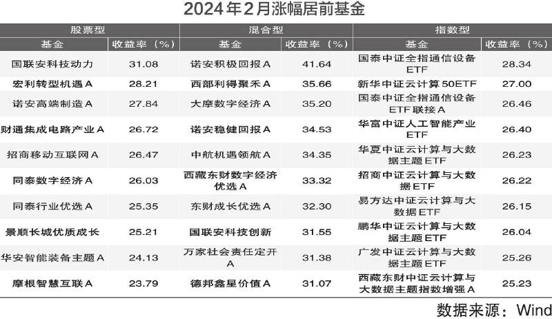 在涨幅榜上,诺安积极回报A在今年2月以41.64%的收益率领涨混合型基金。根据基金四季报,该基金在去年末主要投资在人工智能领域,算法、应用,算力端都有相应布局,其前十大重仓股分别是中际旭创、天孚通信、高新发展、新易盛、中科曙光、寒武纪、浪潮信息、科大讯飞、软通动力、剑桥科技。紧跟其后的西部利得聚禾A、大摩数字经济A、诺安稳健回报A、中航机遇领航A、西藏东财数字经济优选A也在该月取得较好收益,涨幅分别为35.66%、35.20%、34.53%、34.35%、33.32%。值得一提的是,上述基金均在去年末重点配置计算机板块、通信板块等。