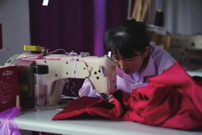 丁集当地女性通过制作婚纱礼服月入过万,同时兼顾了家庭。(郭家宝 摄)