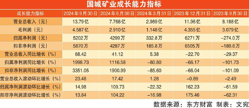 2024年前三季度,国城矿业实现营业收入13.79亿元,同比增长68.42%;归母净利润5202万元,同比增长1998.73%;扣非净利润5870.35万元,增幅高达3351.05%。对于业绩的大幅增长,公司表示,主要是公司银精矿的产量和销售价格较上年同期上升,导致产品毛利大幅提升。此外,公司还新增钛白粉销售。