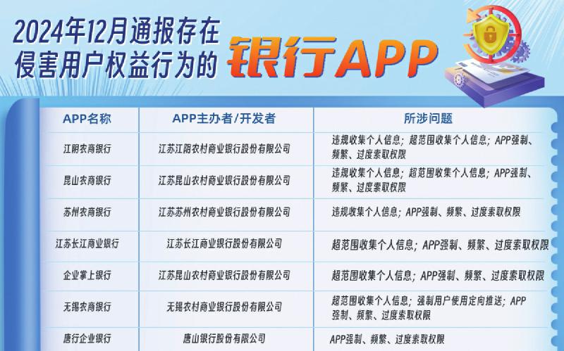 2024年12月24日,江苏省通信管理局发布《2024年第5批关于侵害用户权益行为的APP通报》,涉及江阴农商银行、昆山农商银行、苏州农商银行、江苏长江商业银行、无锡农商银行5家银行的6款APP。