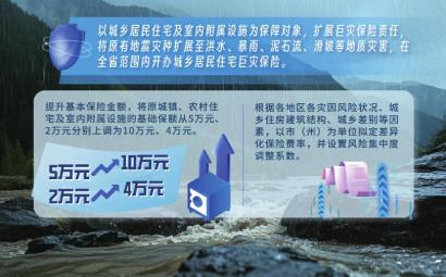同时,提升基本保险金额,将原城镇、农村住宅及室内附属设施的基础保额从5万元、2万元分别上调为10万元、4万元,根据各地区各灾因风险状况、城乡住房建筑结构、城乡差别等因素,以市(州)为单位拟定差异化保险费率,并设置风险集中度调整系数。