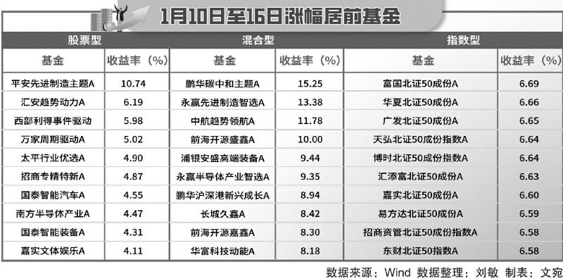 从涨幅来看,富国北证50成份A、华夏北证50成份A、广发北证50成份A、天弘北证50成份指数A、博时北证50成份指数A周内以超6%的收益率领先,收益率分 别 为 6.69% 、6.66% 、6.65% 、6.64%、6.64%。同时,汇添富北证50成份A、嘉实北证50成份A、易方达北证50成份A、招商资管北证50成份指数A、东财北证50指数A也在周内涨超6%。Wind数据显示,北证 50 指数周内大涨7.01%。