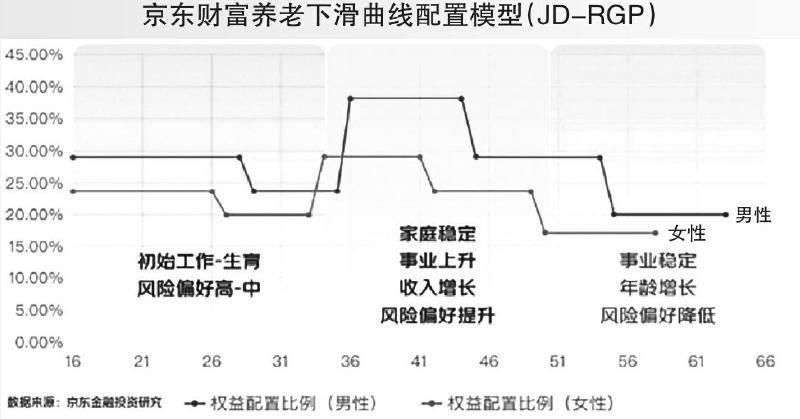 京东金融相关负责人介绍,京东金融参考海外模型构建思路,基于自身财富管理十年来所积累的用户洞察数据和调研数据,参考国内大类资产风险收益表现,构建了适合我国国情的京东财富养老下滑曲线配置模型(JD-RGP),更好地服务投资者。