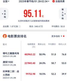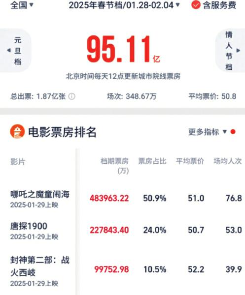 灯塔专业版数据显示,截至2月5日零点,2025年春节档(1月28日至2月4日)总票房约95.11亿元,日均票房约11.9亿元,总观影人次突破1.87亿。其中,《哪吒之魔童闹海》(以下简称:《哪吒2》)以48.39亿元断层领跑,《唐探1900》《封神第二部:战火西岐》分别以22.78亿元和9.97亿元分列档期二、三位。