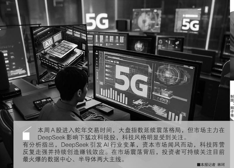 本周A股进入蛇年交易时间,大盘指数延续震荡格局,但市场主力在DeepSeek影响下猛攻科技股,科技风格明显受到关注。有分析指出,DeepSeek引发AI行业变革,资本市场闻风而动,科技阵营反复走强并持续创造赚钱效应。在市场震荡背后,投资者可持续关注目前最火爆的数据中心、半导体两大主线。