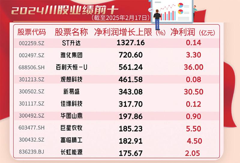 就已披露业绩预告的川股来看,ST升达业绩出现超过13倍的增长,高居川股业绩增速榜第一位。此外,雅化集团、百利天恒、观想科技、新易盛等17家川股预计将出现翻番增长。值得一提的是,川股业绩分化也开始加大,天齐锂业、盛新锂能、帝欧家居等45家川股将出现不同程度的亏损。■本报记者 林珂