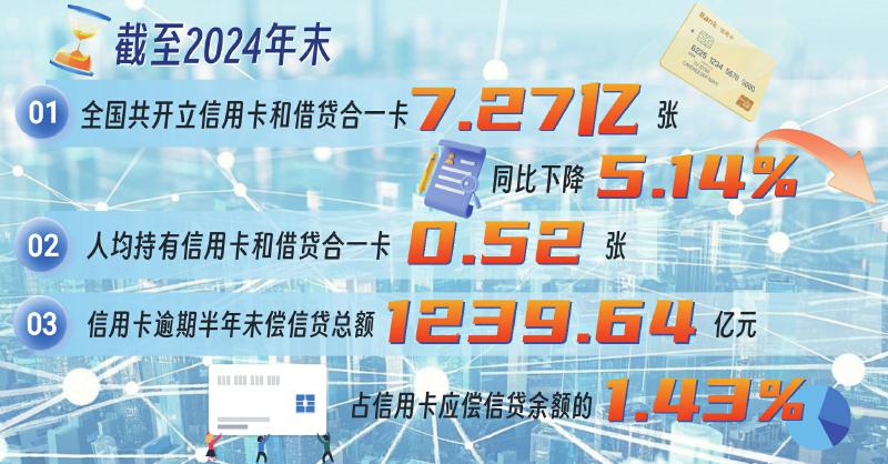 近年来,我国信用卡增速明显放缓,行业逐渐进入存量竞争时代。2月14日,中国人民银行发布2024年支付体系运行总体情况,数据显示,截至2024年年末,信用卡和借贷合一卡总数为7.27亿张,同比下降5.14%。人均持有信用卡和借贷合一卡为0.52张。2022年第四季度以来,已连续九个季度下降。