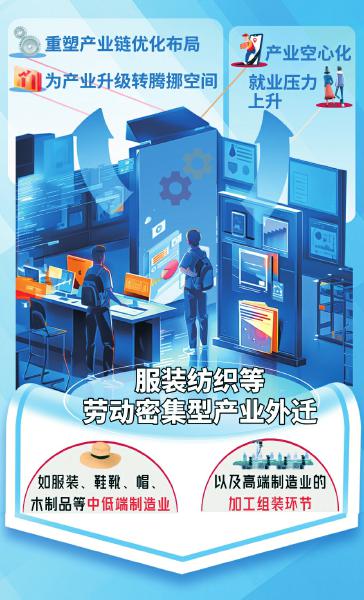 与此同时,一些专家也提醒,近年来,以服装纺织为代表的劳动密集型产业出现了外迁现象,对于这种行为要予以警惕。同时,在产业链转移过程中,要留住产业链关键环节,或者避免产业流出速度过快,防止产业“空心化”问题。