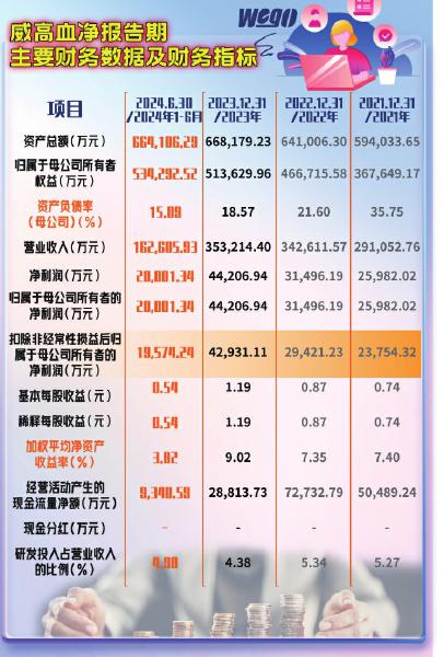 招股书显示,2021年至2024年上半年,威高血净分别实现营业收入29.11亿元、34.26亿元、35.32亿元和16.26 亿 元 ,同 比 增 长 率 分 别 为10.15%、17.71%、3.09%和-3.49%。同期公司实现净利润分别为2.6亿元、3.15亿元、4.42亿元和2亿元,同比增长率分别为-12.41%、21.22%、40.36%和-12.56%。