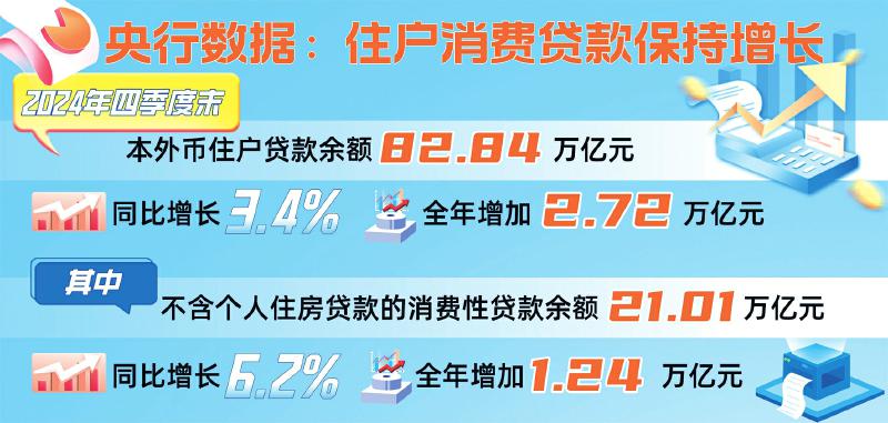 央行数据显示,住户消费贷款保持增长。2024年四季度末,本外币住户贷款余额 82.84 万亿元,同比增长3.4%,全年增加2.72万亿元。其中,不含个人住房贷款的消费性贷款余额21.01万亿元,同比增长6.2%,全年增加1.24万亿元。