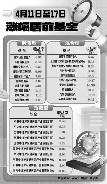 混合基金方面,4月11日至17日,4938只基金平均收益为1.06%,共有3794只基金收益为正。同时,涨超5%的基金共有93只。