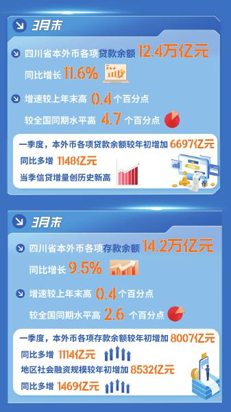 今年一季度,四川金融总量平稳增长。数据显示,3月末,全省本外币各项贷款余额12.4万亿元,同比增长11.6%,增速较上年末提高0.4个百分点,较全国同期水平提高4.7个百分点。一季度,本外币各项贷款余额较年初增加6697亿元,同比多增1148亿元,当季信贷增量创历史新高。