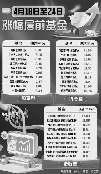 混合基金方面,4月18日至24日,4663只基金平均收益为1.21%,共有3733只基金收益为正,占比达到八成。同时,涨超5%的基金共有144只。