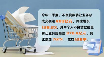 数据显示,不良贷款转让业务成交规模增长迅猛。据统计,2025年一季度,不良贷款转让业务总成交 额 达 483 亿 元 , 同 比 增 长138.8%,其中个人不良贷款批量转让业务规模达370.4亿元,同比增加761%,成交128单。