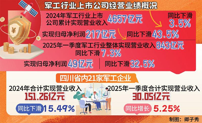2025年一季度,四川省内21家军工企业合计实现营业收入30.05亿元,同比增长5.25%;实现净利润1.87亿元,同比下滑19.78%。四川军工企业的营业收入逆行业增长,净利润降幅则低于行业。
