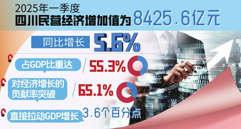 金融投资报记者注意到,今年一季度,四川省民营经济增加值为8425.6亿元,同比增长5.6%,占GDP的比重达55.3%,民营经济稳居全省经济增长贡献的“主力军”地位。随着民营经济促进法落地,营商环境将进一步优化,也将激发四川民营企业的发展活力。■本报记者刘敏