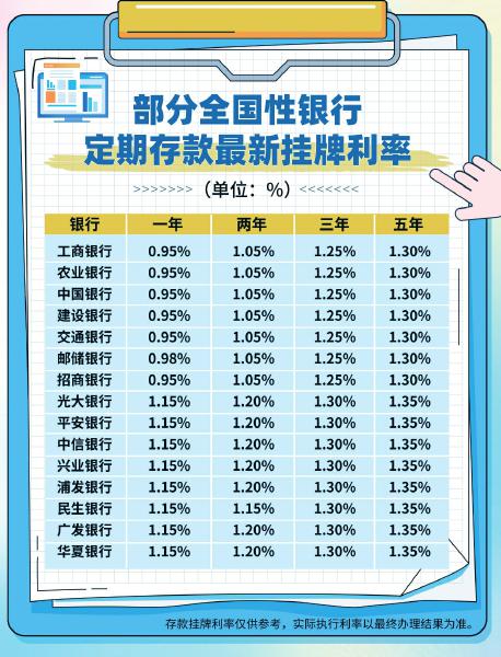 股份行方面,由于此前挂牌利率不同,各家股份行调整后的利率水平也有小幅差异。其中,1年期定存利率下调至0.95%—1.15%;2 年定存利率下调至1.05%—1.20%;3年期定存利率下调至1.25%—1.30%;5 年定存利率下调至1.30%—1.35%。
