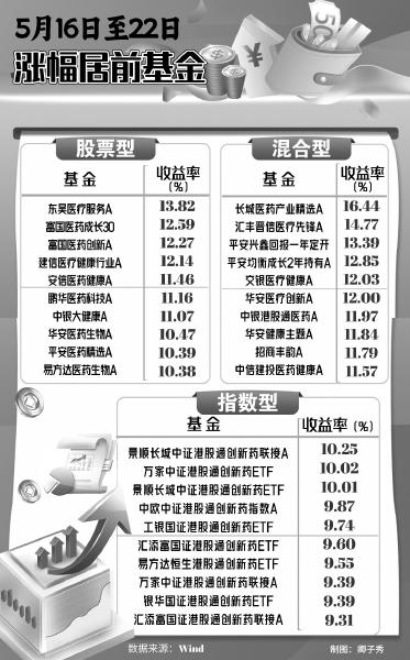 混合基金方面,5月16日至22日,4660只基金平均收益为0.57%,共有3304只基金收益为正,占比超过七成。同时,涨超5%的基金有102只。