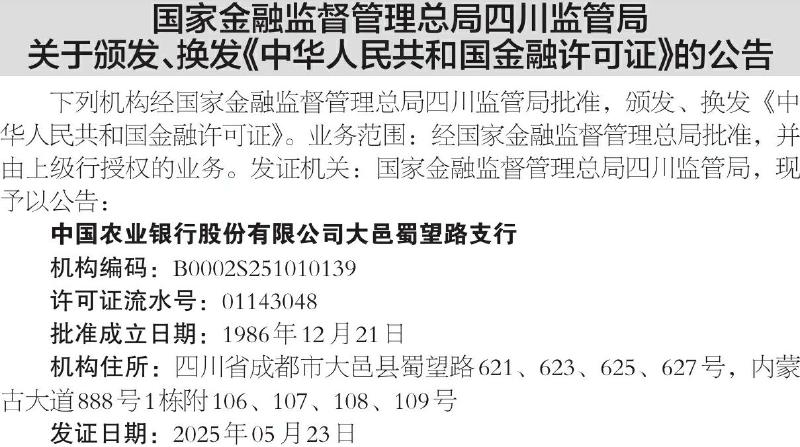 ·国家金融监督管理总局四川监管局关于颁发、换发《中华人民共和国金融许可证》的公告