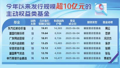 除了东方红核心价值外,近期成立的多只主动权益类基金的发行规模也在10亿元以上。6月4日,富国均衡投资成立,发行规模为19.64亿元,是今年以来募集规模仅次于东方红核心价值的主动权益类基金,募集有效认购总户数为8924户。同日,安信优选价值也宣告成立,发行规模为13.12亿元,募集有效认购总户数为4909户。6月3日,申万菱信行业精选成立,发行规模为12.19亿元,募集有效认购总户数为10477户,该基金的基金经理正是原招商基金明星基金经理贾成东。贾成东于去年12月加入申万菱信基金,这是其在申万菱信基金管理的第二只产品。此前,贾成东在招商基金管理的多只产品的年化回报率都在10%以上。