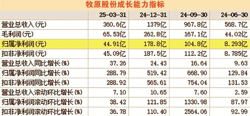今年以来,养殖行业的业绩整体呈现快速反弹趋势,成本下降以及产品售价上涨是其主要原因。就生猪养殖龙头牧原股份来看,2025年一季度,公司实现营业总收入360.61亿元,同比增长37.26%;归母净 利 润 44.91 亿 元 ,同 比 增 加288.79%。当季,公司销售商品猪1839.5万头,种仔猪426.2万头。牧原股份表示,经过不断降本增效,公司生猪养殖成本已从2024年初的15.8元/公斤,下降到今年3月的12.5元/公斤,处于行业领先水平。
