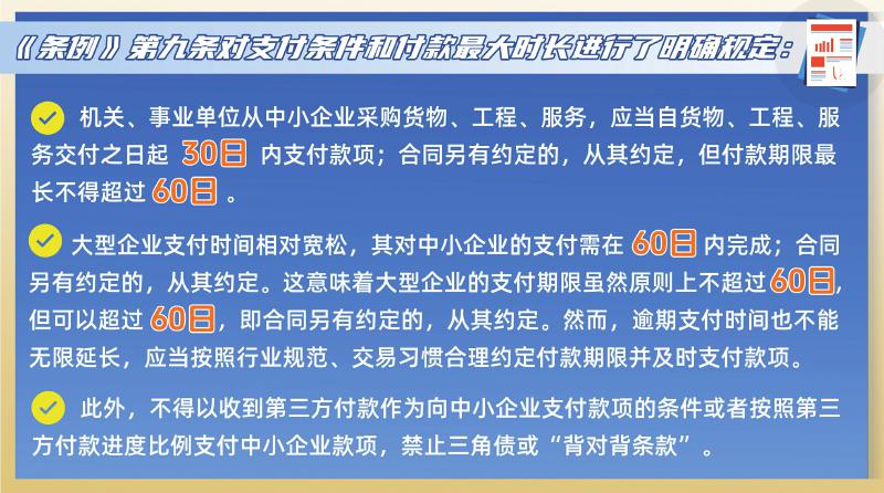 《条例》第九条对支付条件和付款最大时长进行了明确规定:机关、事业单位从中小企业采购货物、工程、服务,应当自货物、工程、服务交付之日起30日内支付款项;合同另有约定的,从其约定,但付款期限最长不得超过60日。大型企业支付时间相对宽松,其对中小企业的支付需在60日内完成;合同另有约定的,从其约定。这意味着大型企业的支付期限虽然原则上不超过60日,但可以超过60日,即合同另有约定的,从其约定。然而,逾期支付时间也不能无限延长,应当按照行业规范、交易习惯合理约定付款期限并及时支付款项。此外,不得以收到第三方付款作为向中小企业支付款项的条件或者按照第三方付款进度比例支付中小企业款项,禁止三角债或“背对背条款”。