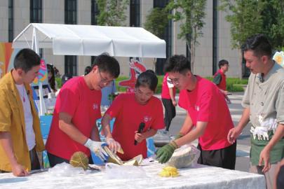 海南三亚优旗榴莲科技小院的同学们正在介绍国产树上自然成熟的榴莲。 摄影 王心悦