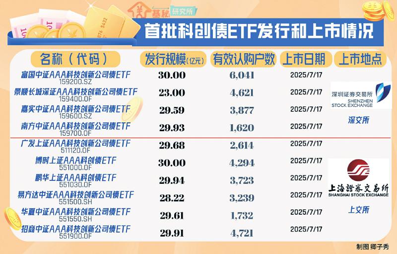 回顾首批科创债ETF的诞生,可谓非常迅速。6月18日,证监会主席吴清在2025陆家嘴论坛上提出“加快推出科创债ETF”,当天10家公募机构集体上报新产品,7月2日正式获批,7月7日首发当天全部结束募集,7月10日全部成立,再到7月17日即将上市交易,全程耗时刚好一个月。