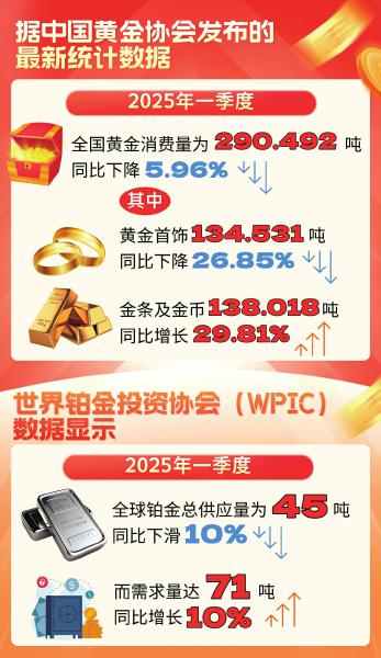 受高金价压制,黄金首饰消费需求持续疲软。据中国黄金协会发布的最新统计数据,2025年一季度,全国黄金消费量290.492吨,同比下降5.96%。其中黄金首饰134.531吨,同比下降26.85%;金条及金币 138.018 吨,同比增长29.81%。