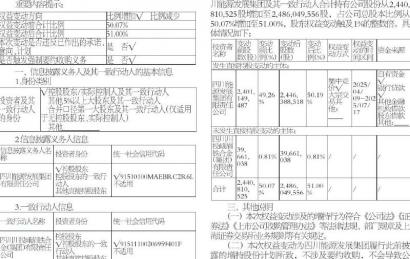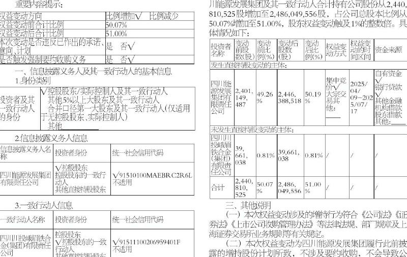 (三)公司在前期公告中披露了关于公司原控股股东川投集团与四川省能源投资集团有限责任公司实施新设合并设立四川能源发展集团事宜。具体内容详见公司分别于2025年3月1日,2025年3月6日披露的相关公告及要件。本次合并完成后,公司控股股东已由川投集团变更为四川能源发展集团,实际控制人仍为四川省国资委。本次控股股东权益变动涉及的川投集团直接持有的公司股份尚未完成中国证券登记结算有限责任公司的登记过户程序,相关工商变更登记手续尚未完成。
