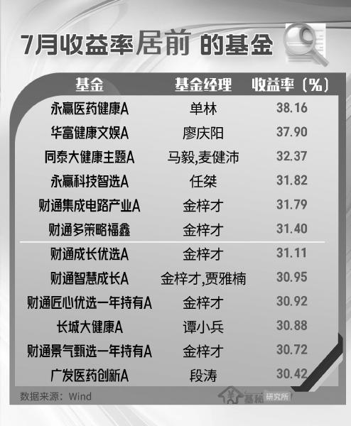 据Wind统计,权益类基金中,7月共有12只基金收益率超30%,均为主动权益类基金。永赢医药健康A、华富健康文娱A、同泰大健康主题A的收 益 率 分 别 为 38.16% 、37.90% 、32.37%,在排行榜上名列前茅。从基金名称可以看出,这几只基金均为医药主题基金,且从基金二季报来看,这些基金均主要持有来自科创板和创业板的医药股。
