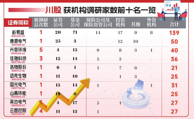 进入下半年以后,机构投资者的调研频率明显加快。Wind统计数据显示,下半年以来,已有32家川股获得机构投资者不同形式的调研。从行业分类来看,科技、公用事业、大消费等行业是机构关注的重点。从机构调研频次来看,共有18家川股获得超两位数的机构调研。其中,新易盛调研机构数量高居榜首,达到139家。