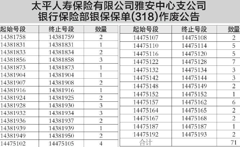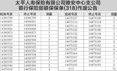 ·太平人寿保险有限公司雅安中心支公司银行保险部银保保单(318)作废公告