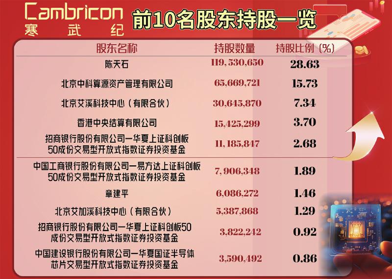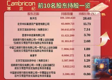 第二大股东为北京中科算源资产管理有限公司,持股比例为15.73%。另外,多只科创主题ETF交投活跃且溢价明显,重仓寒武纪的不少主动权益基金则录得了30%至40%的净值涨幅。