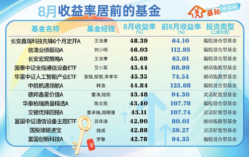 从单只基金的净值涨幅来看,8月权益类基金表现出色,共有32只基金月度收益率超过40%,最高超过48%。