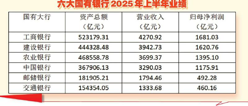 六大国有银行方面,上半年实现营业收入合计规模达1.8万亿元,合计实现归母净利润6825.24亿元。具体来看,工商银行、建设银行、农业银行、中国银行、邮储银行、交通银行上半年归母净利润分别为1681.03亿元、1620.76亿元、1395.10亿元、1175.91亿元、492.28亿元、460.16亿元。