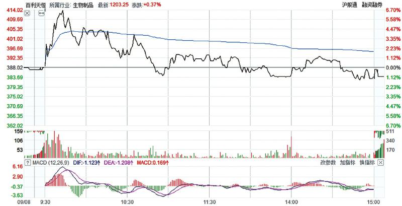 反观二级市场,百利天恒的股价表现则和其经营业绩形成了巨大的反差。今年初,该股经过小幅震荡后便进入上升通道,股价重心持续抬高。在大盘剧烈震荡中,百利天恒表现出明显的抗跌性并逆势上攻。截至9月8日,百利天恒盘中股价最高摸至414.02元,收盘时小幅下跌,股价报收384元,股价远高于川股第二名新易盛的314.50元,百利天恒由此成为四川上市公司的新“股王”。