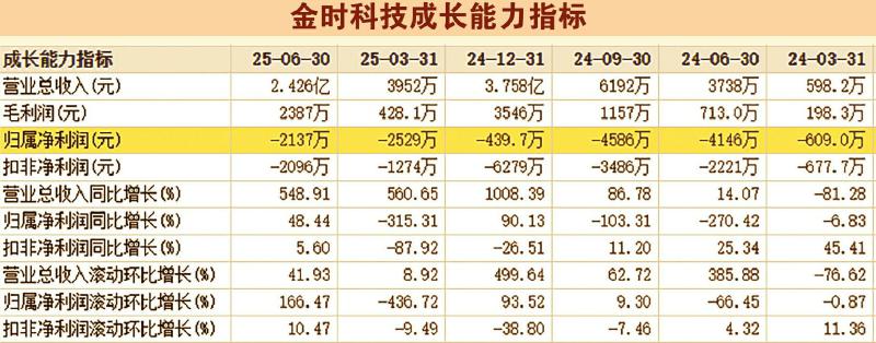 从基本面看,尽管金时科技仍在持续亏损,但其盈利能力已开始出现明显改善。2025年上半年,公司实现营业收入2.42亿元,同比增长548.91%;实现净利润为亏损2137.31万元,同比减亏48.4%。金时科技表示,自2024年实施向新能源储能业务领域的战略转型后,市场开拓及订单交付能力提升,上半年储能行业的高速发展和市场需求激增,拉动营收大幅增长,销售毛利额增加。