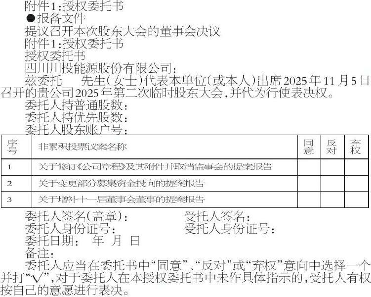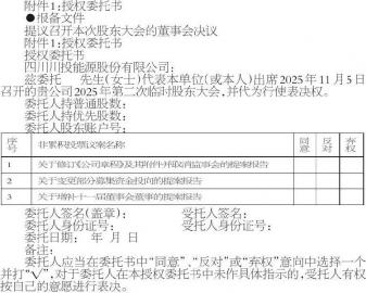 重要内容提示: ●股东大会召开日期:2025年11月5日 ●本次股东大会采用的网络投票系统:上海证券交易所股东大会网络投票系统 一、召开会议的基本情况 (一)股东大会类型和届次 2025年第二次临时股东大会 (二)股东大会召集人:董事会( 三)投票方式:本次股东大会所采用的表决方式是现场投票和网络投票相结合的方式 (四)现场会议召开的日期、时间和地点 召开的日期时间:2025年11月5日 10点00分 召开地点:四川省成都市武侯区临江西路1号1508会议室 (五)网络投票的系统、起止日期和投票时间。 网络投票系统:上海证券交易所股东大会网络投票系统 网络投票起止时间:自2025年11月5日至2025年11月5日 采用上海证券交易所网络投票系统,通过交易系统投票平台的投票时间为股东大会召开当日的交易时间段,即9:15-9:25,9:30-11:30,13:00-15:00;通过互联网投票平台的投票时间为股东大会召开当日的9:15-15:00。 (六)融资融券、转融通、约定购回业务账户和沪股通投资者的投票程序 涉及融资融券、转融通业务、约定购回业务相关账户以及沪股通投资者的投票,应按照《上海证券交易所上市公司自律监管指引第1号 — 规范运作》等有关规定执行。 (七)涉及公开征集股东投票权 无 二、会议审议事项 本次股东大会审议议案及投票股东类型 1、各议案已披露的时间和披露媒体 上述提案已经公司第十一届四十次和四十一次董事会审议通过,相关内容详见于2025年8月15日和10月21日在《中国证券报》《上海证券报》《证券时报》《金融投资报》和上交所网站披露的相关公告及后续公司在上交所网站披露的股东大会会议资料。 本次股东大会会议文件将于2025年10月28日在上交所网站披露。 2、特别决议议案:1 3、对中小投资者单独计票的议案:3 4、涉及关联股东回避表决的议案:无 应回避表决的关联股东名称:无 5、涉及优先股股东参与表决的议案:无 三、股东大会投票注意事项 (一)本公司股东通过上海证券交易所股东大会网络投票系统行使表决权的,既可以登陆交易系统投票平台(通过指定交易的证券公司交易终端)进行投票,也可以登陆互联网投票平台(网址:vote.sseinfo.com)进行投票。首次登陆互联网投票平台进行投票的,投资者需要完成股东身份认证。具体操作请见互联网投票平台网站说明。 (二)持有多个股东账户的股东,可行使的表决权数量是其名下全部股东账户所持相同类别普通股和相同品种优先股的数量总和。 持有多个股东账户的股东通过本所网络投票系统参与股东大会网络投票的,可以通过其任一股东账户参加。投票后,视为其全部股东账户下的相同类别普通股和相同品种优先股均已分别投出同一意见的表决票。 持有多个股东账户的股东,通过多个股东账户重复进行表决的,其全部股东账户下的相同类别普通股和相同品种优先股的表决意见,分别以各类别和品种股票的第一次投票结果为准。 (三)同一表决权通过现场、本所网络投票平台或其他方式重复进行表决的,以第一次投票结果为准。 (四)股东对所有议案均表决完毕才能提交。 四、会议出席对象 (一)股权登记日收市后在中国证券登记结算有限责任公司上海分公司登记在册的公司股东有权出席股东大会(具体情况详见下表),并可以以书面形式委托代理人出席会议和参加表决。该代理人不必是公司股东。 (二)公司董事、监事和高级管理人员。 (三)公司聘请的律师。 (四)其他人员 五、会议登记方法 (一)登记方式: 法人股东由法定代表人出席会议的,应持营业执照复印件(加盖法人印章)、本人身份证和法人股东账户卡;法人股东委托代理人出席会议的,委托代理人应持营业执照复印件(加盖法人印章)、本人身份证、法定代表人依法出具的授权委托书和法人股东账户卡。个人股东亲自出席会议的,应持本人身份证、股票账户卡;委托代理人出席会议的,应持本人身份证、授权委托书和委托人股东账户卡、委托人身份证。异地股东可用传真方式或邮寄复印件方式登记。 (二)登记地点: 四川省成都市武侯区临江西路1号20楼川投能源证券事务部。 (三)登记时间: 2025年11月3日(上午9:00~12:00,下午2:00~5:00),异地股东可采取信函或传真的方式登记,但要确保公司最迟于2025年11月3日下午5:00前收到。其他相关事宜按公司《股东大会议事规则》办理。 六、其他事项 (一)联系方式: 联系人:证券事务部 电话:028-86098649 传真:028-86098648 电子邮箱:zqb@ctny.com.cn (二)会期半天,参加会议的股东食宿费、交通费用自理 特此公告。 四川川投能源股份有限公司董事会 2025年10月21日
