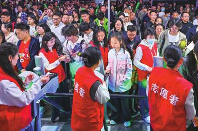 “请大家注意安全,有序排队安检。”志愿者邹晴柔早在下午4点钟就来到了现场,她主要负责10号出入口的检票工作。