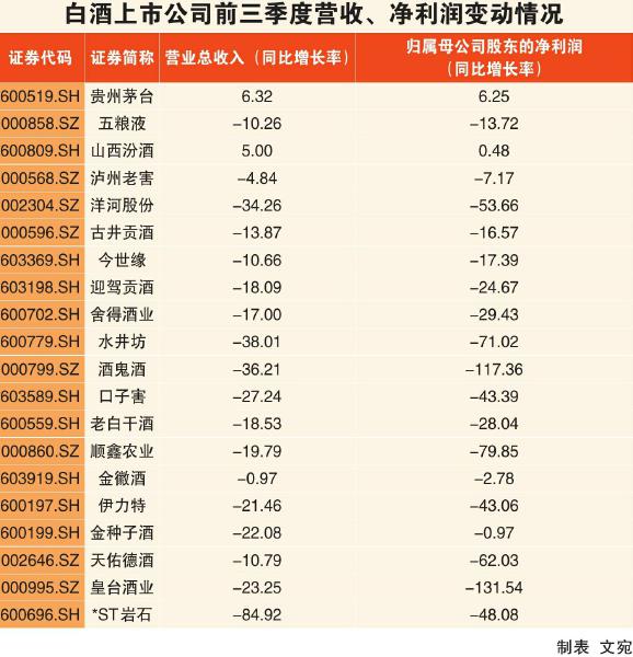 在白酒行业深度调整的背后,头部企业分化加剧。贵州茅台增长放缓,而多数酒企则出现营收、利润齐跌的情况。随着所有上市白酒企业交出前三季度成绩单后,显示这场行业寒冬在第三季度加速蔓延。