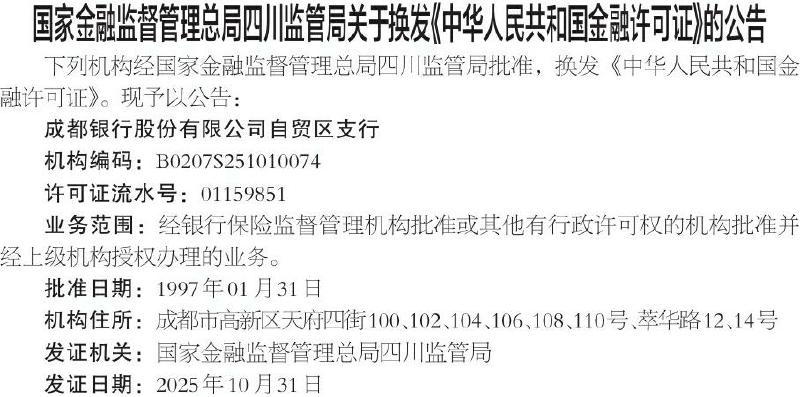 ·国家金融监督管理总局四川监管局关于换发《中华人民共和国金融许可证》的公告