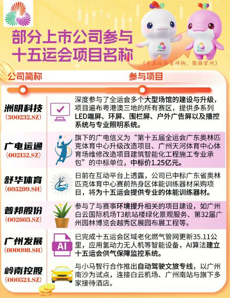 洲明科技董事会秘书陈一帆向上海证券报记者透露,公司深度参与了全运会多个大型场馆的建设与升级,项目遍布粤港澳三地的所有赛区,提供多系列 LED 端屏、环屏、围栏屏、户外广告屏以及播控系统与专业照明系统。