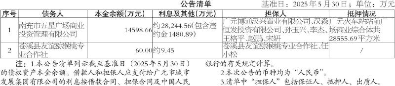 根据四川发展资产管理有限公司与广元市城市发展集团有限公司签署的《债权转让合同》,将基于《项目融资借款合同(成农商现公项借20140007号)》《抵押合同(成农商现公项抵 20140006号)》《保证合同(成农商现公项保20140005)》《流动资金借款合同(J28512021122001)》《抵押合同(D28512021122001)》《保证合同(B28512021122001)》依法享有的全部权利(包括但不限于主债权、担保债权、违约金债权、利息债权等)依法转让给广元市城市发展集团有限公司。现公告通知要求公告清单中所列债务人及其担保人,从公告之日起立即向广元市城市发展集团有限公司履行主债权合同及担保合同约定的还本付息义务或相应的担保责任。