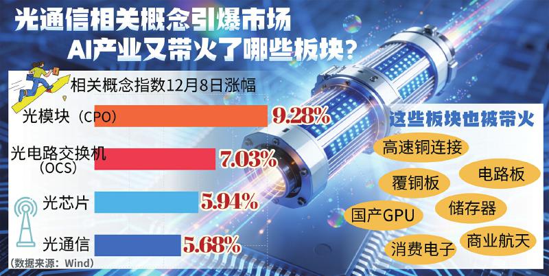 又涨疯了!12月8日,A股光通信相关板块,包括光模块(CPO)、光电路交换机(OCS)、光芯片等概念股集体飙涨。