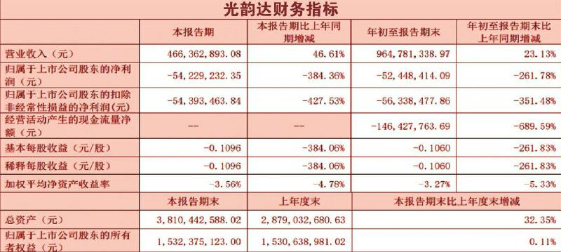 进入2025年,光韵达亏损幅度进一步扩大,前三季度归母净利润为-5244.84万元,同比下降261.78%;同期营业收入为9.65亿元,同比增长23.13%。