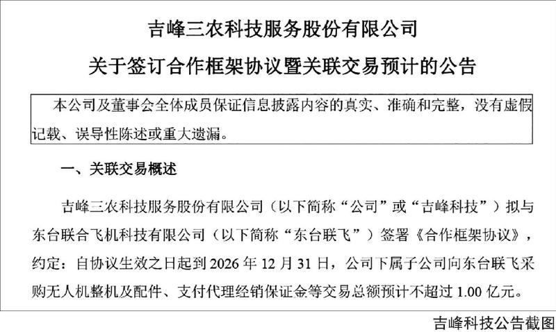 吉峰科技12月11日晚间发布公告称,公司拟与东台联合飞机科技有限公司(下称“东台联飞”)签署《合作框架协议》,约定自协议生效之日起到2026年12月31日,公司下属子公司向东台联飞采购无人机整机及配件、支付代理经销保证金等交易总额预计不超过1.00亿元。
