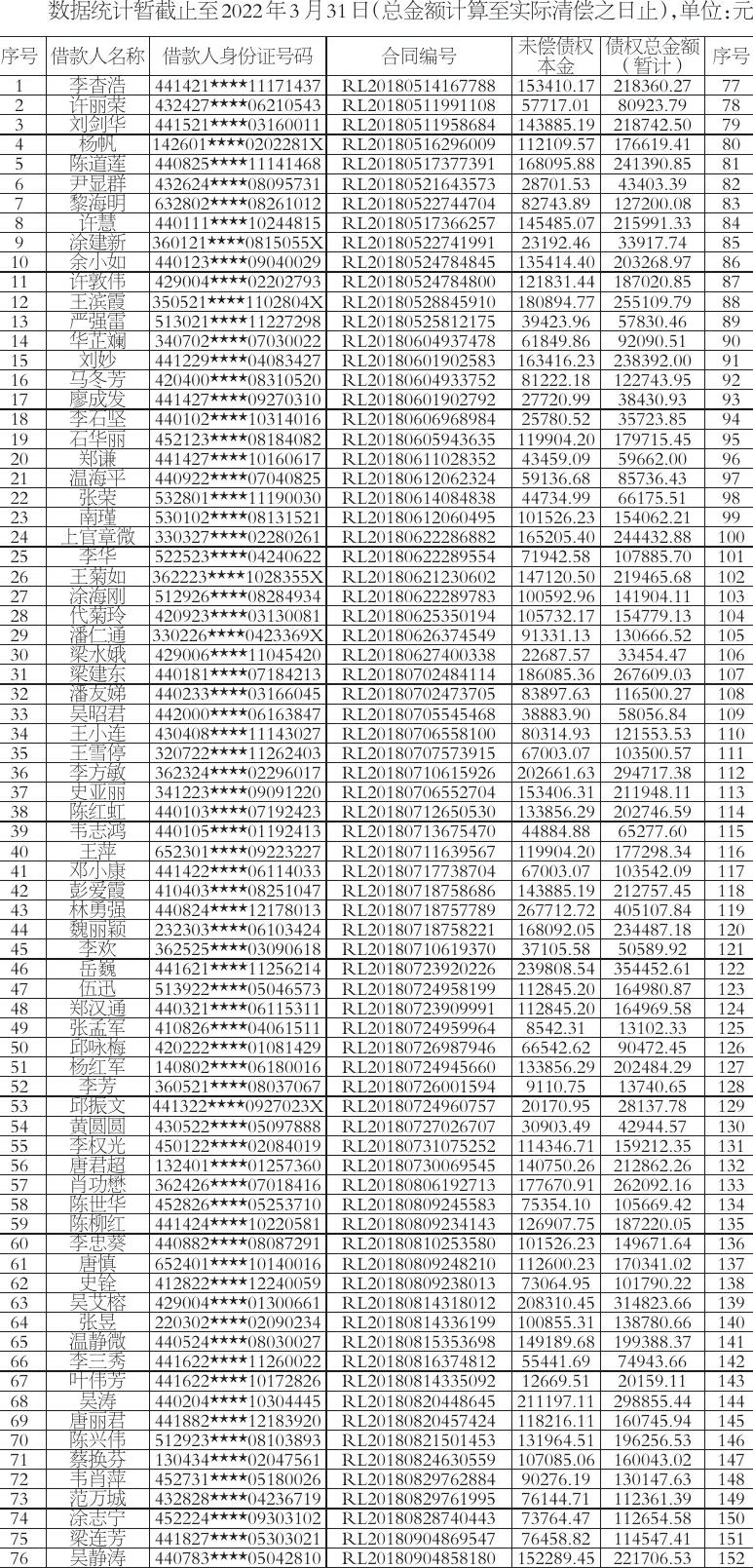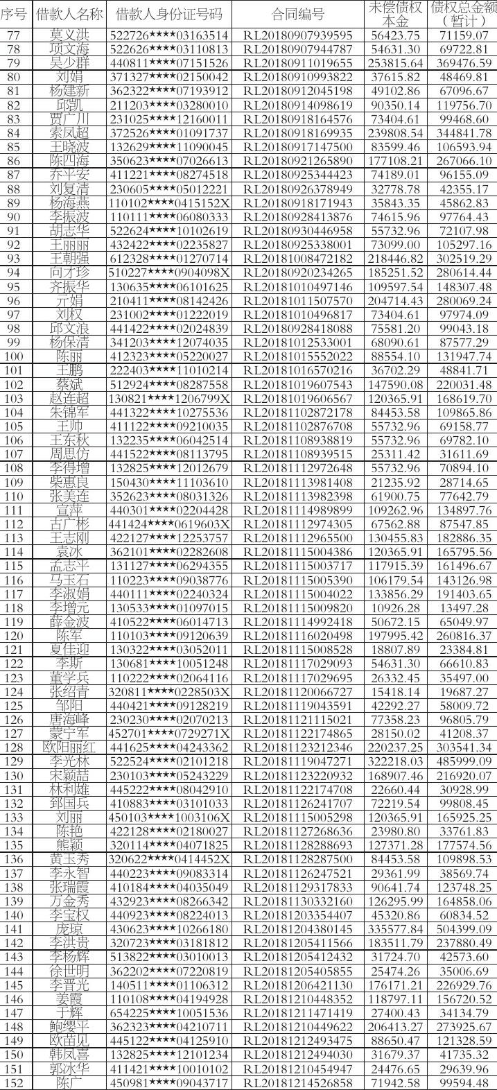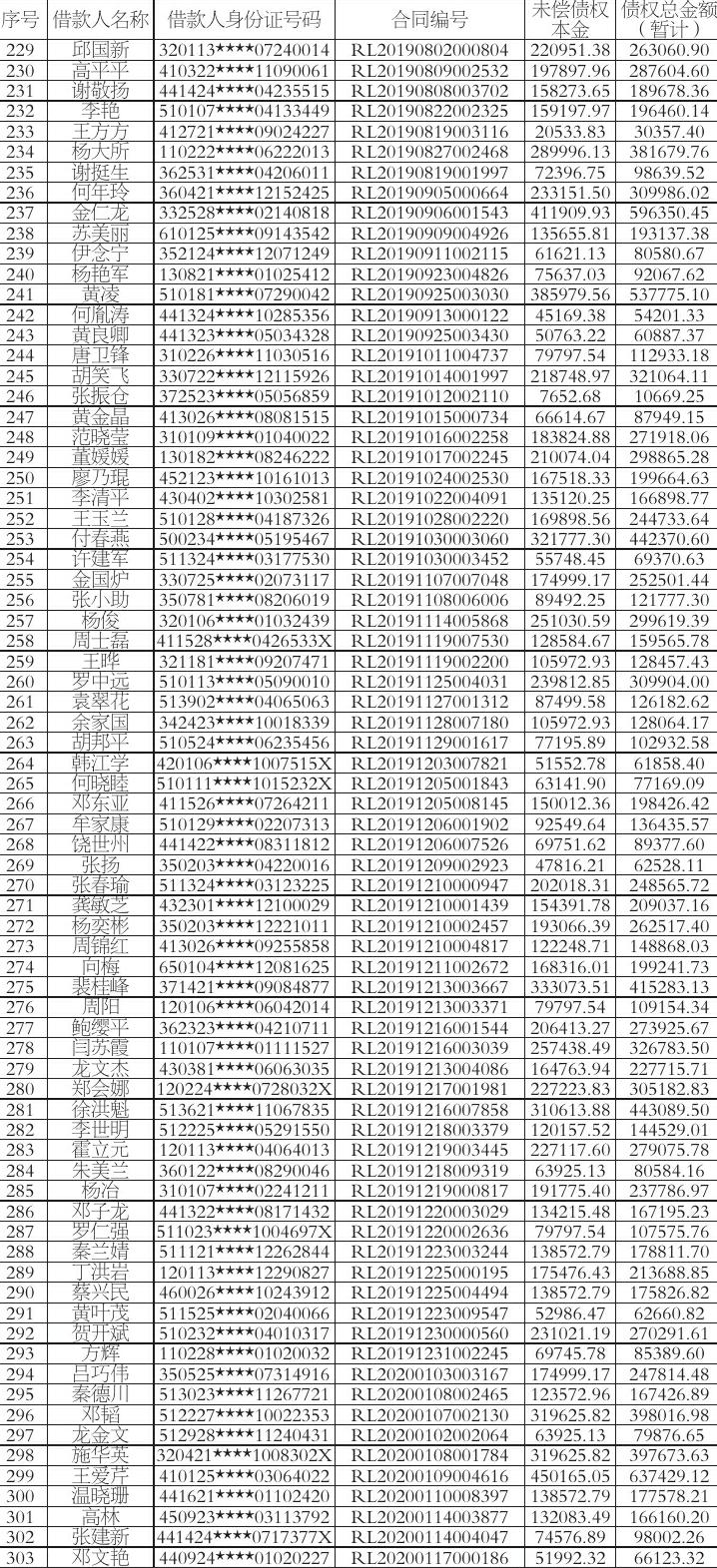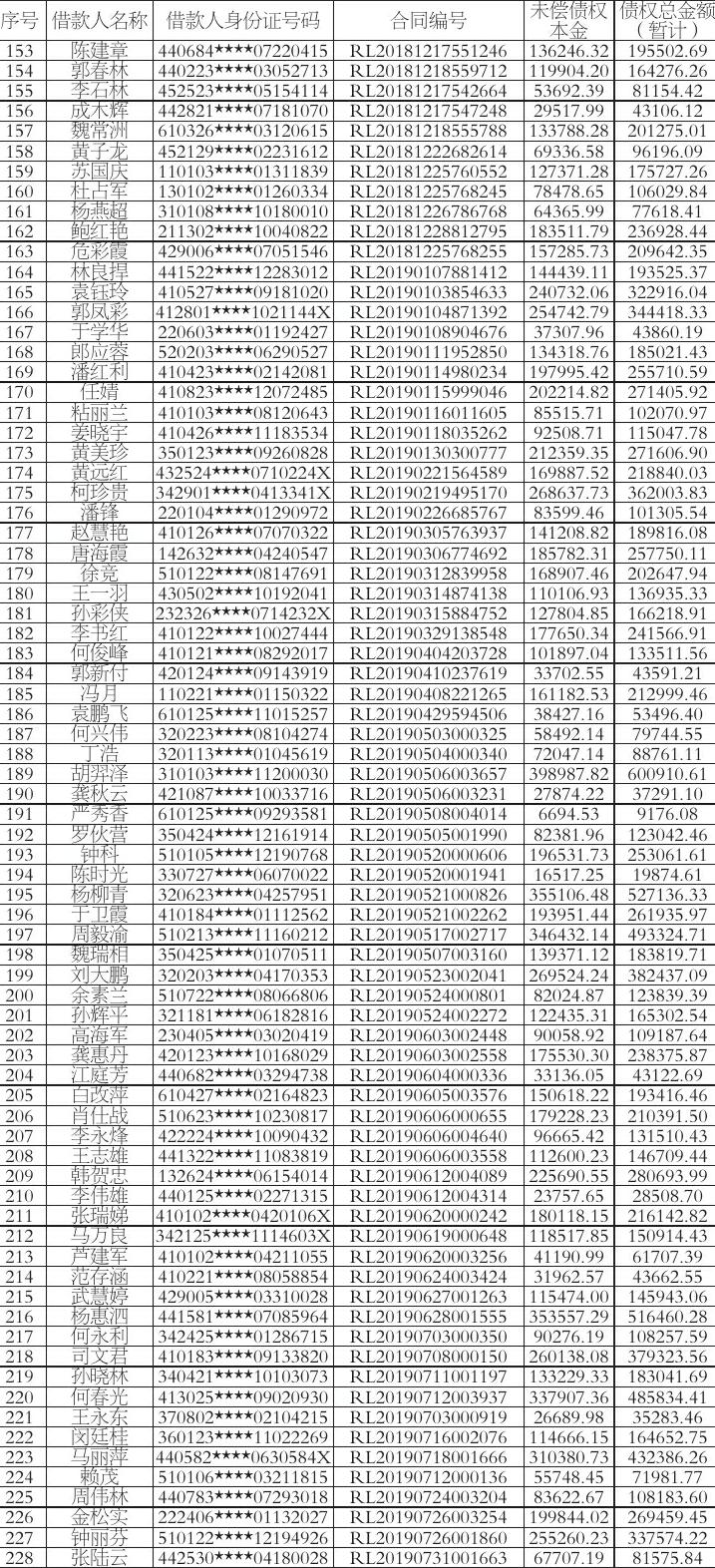 根据上海三藤信息咨询有限公司(下称“上海三藤”)与杭州振大信息科技有限公司(下称“杭州振大”)签署的的《债权转让协议》,上海三藤将对《公告清单》(详见附件)中所列的债权及其附属权利,依法批量转让给杭州振大,上海三藤及杭州振大特发公告通知各债务人及保证人(如有)以及相关承继人。杭州振大作为上述债权的受让人,现要求公告清单中所列债务人(包括债务承继人),从公告之日起立即向杭州振大履行主债权合同及相关文件约定的还本付息义务及其他相应的义务。公告未尽事宜,均以双方签署的转让合同为准。特此公告。